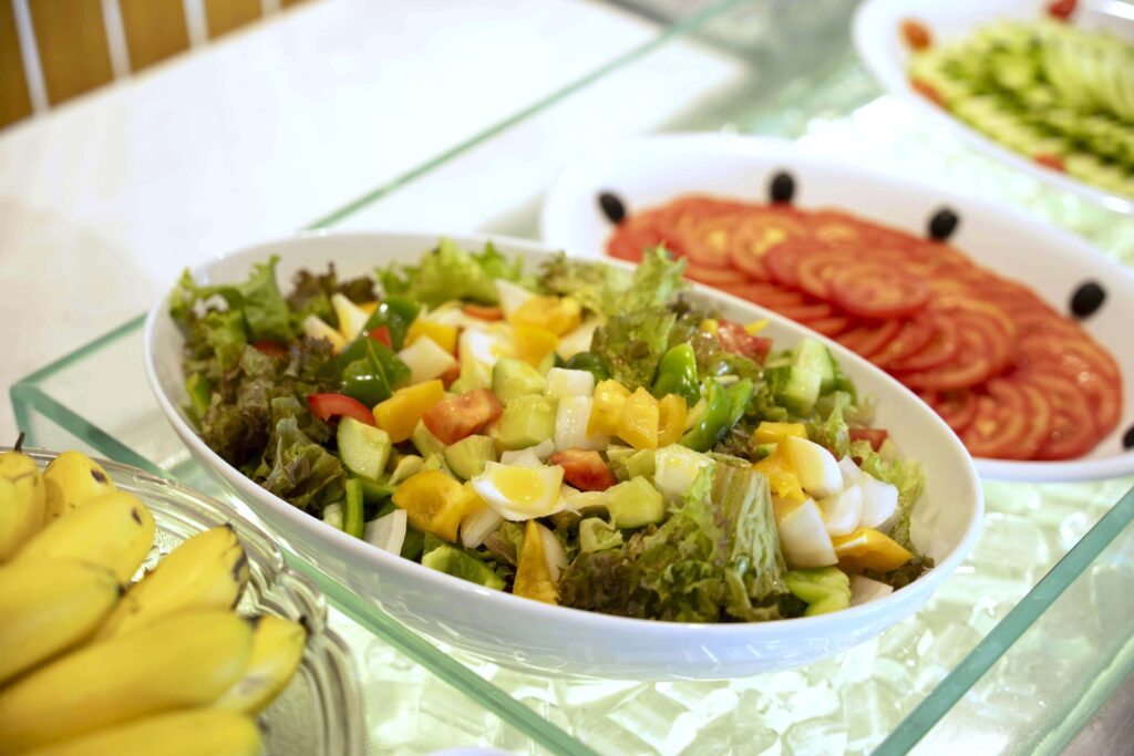 A refreshing selection of crisp vegetables, toppings, and dressings for guests seeking a light, healthy start.